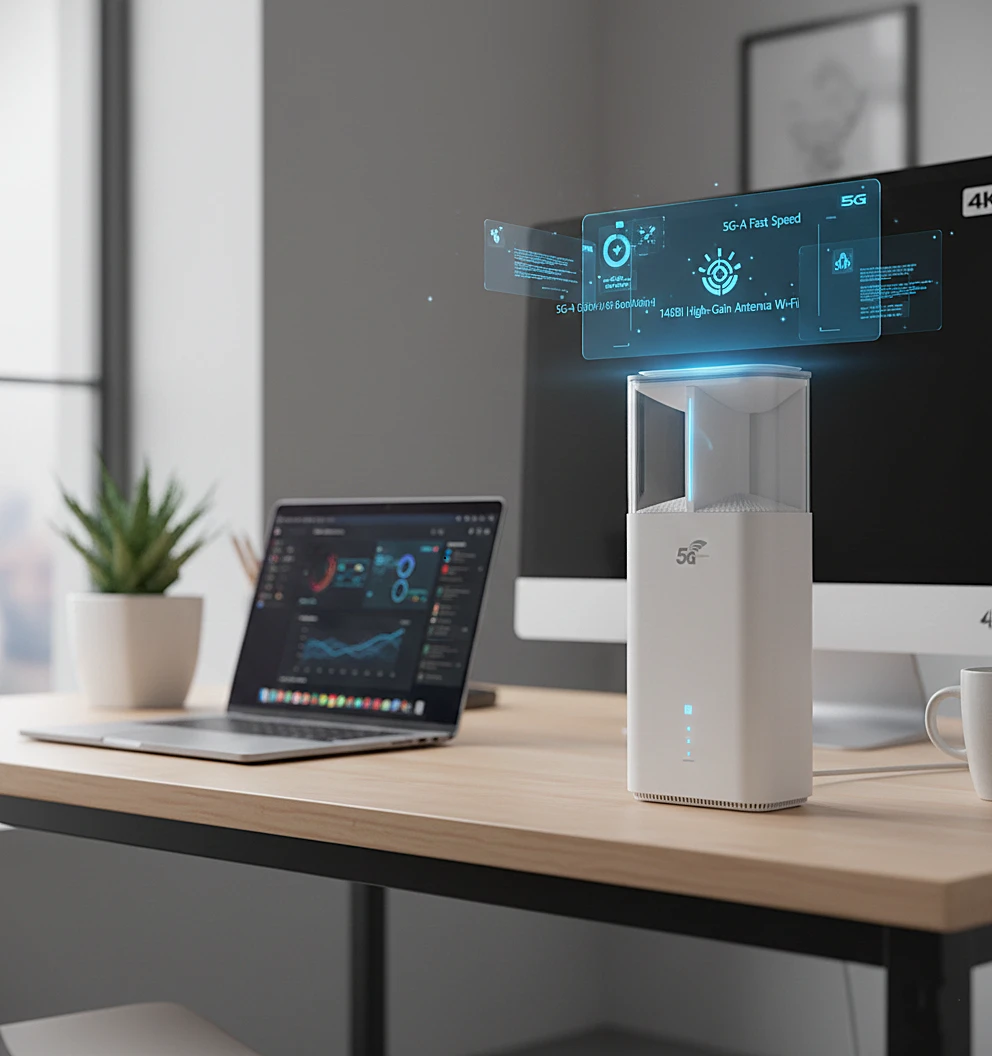 1. A high-speed home router supporting 5G-A technology, featuring a 14dBi High-Gain Antenna for superior signal reception and stable, high-performance Wi-Fi coverage.