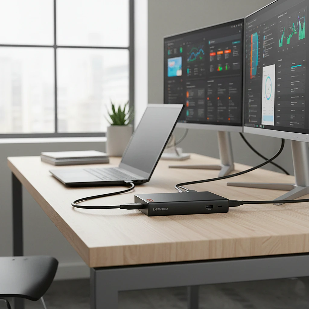Boost your productivity with the Lenovo USB-C Dual Display Travel Dock, the ultimate companion for the modern professional. This compact yet powerful hub allows you to connect up to two 4K monitors, transforming any space into a high-performance workstation. Featuring an adjustable integrated cable and an included power adapter, it provides efficient charging for your laptop up to 65W.