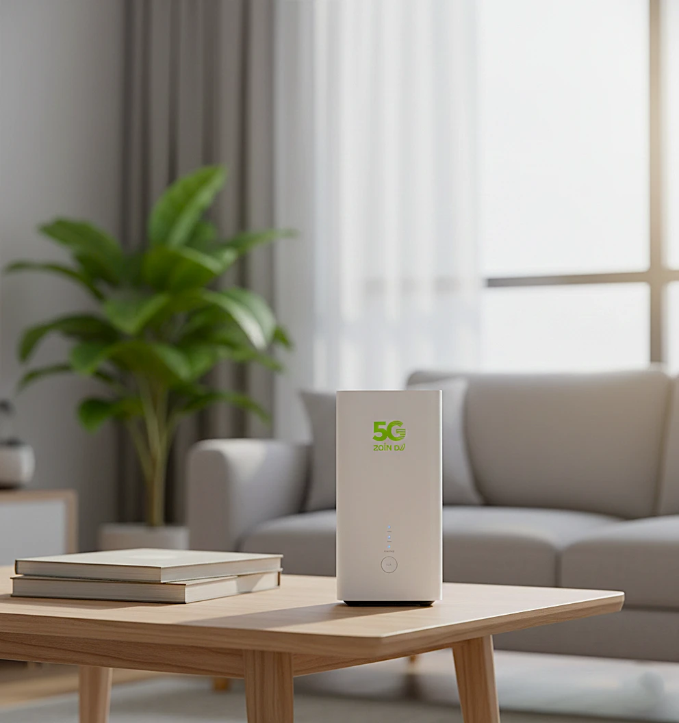 1. A dedicated 5G home router from Zain, featuring advanced Wi-Fi 6 technology with speeds reaching up to 3000Mbps. The device is designed to provide high-speed 5G connectivity for a seamless internet experience, as highlighted by the prominent 5G branding on its sleek white chassis.